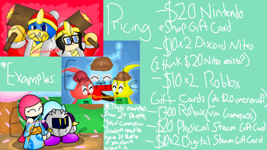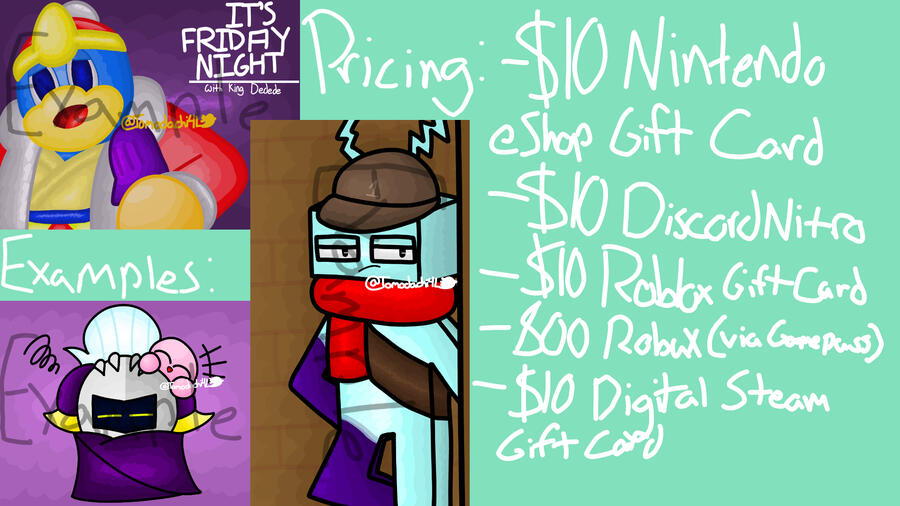 Unlike the majority of people, my commissions work based off of the complexity of the artwork and the amount of detail being put into it. So if you were to commission me a character who is difficult to draw, the price would most likely not be $5. If you want an extra character in the photo, then it would most likely be $10 or up (depending on how difficult those characters are to draw) Want a cool background that isn't a plain color? $20 is the right choice for you mate.